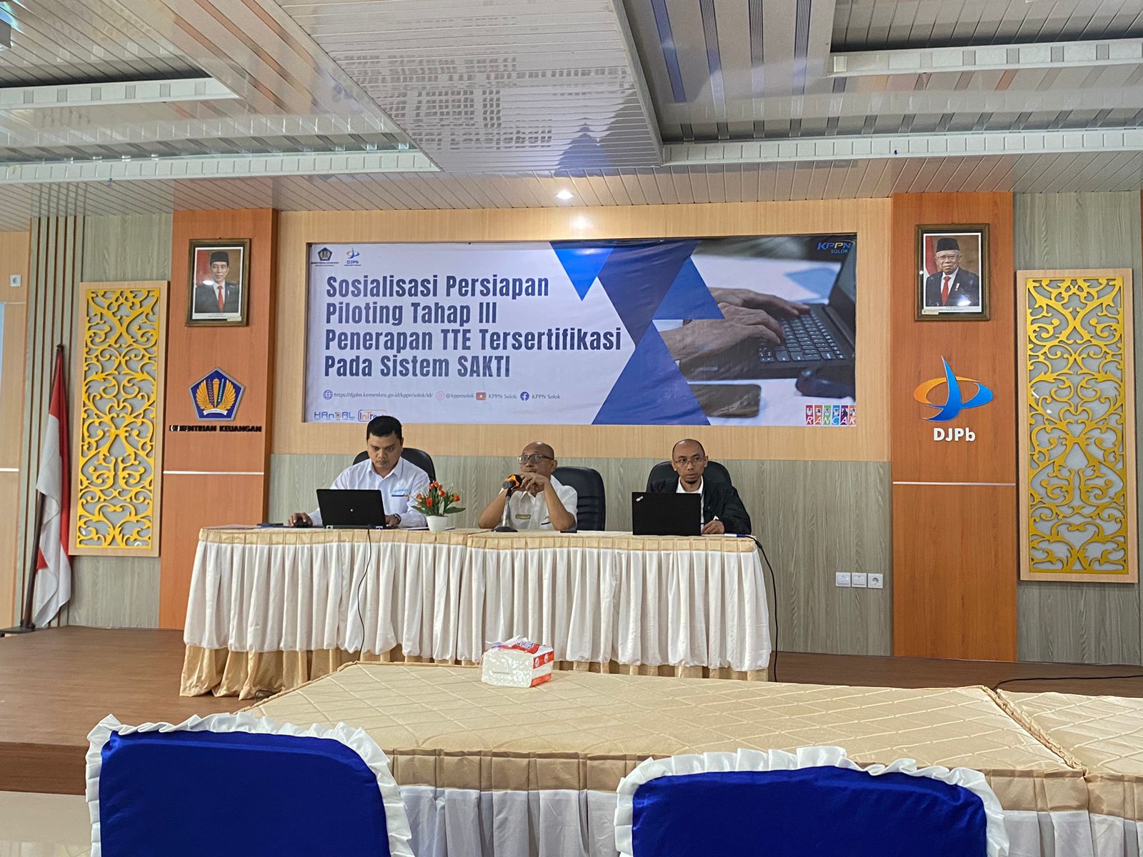 Senin (14/08/2023), sesuai surat undangan Kantor Pelayanan Perbendaharaan Negara (KPPN) Tipe A1 Solok Nomor UND-65/KPN.0303/2023 tanggal 10 Agustus 2023 perihal Undangan Sosialisasi Persiapan Pelaksanaan Piloting Tahap III Penerapan Tanda Tangan Elektronik Tersertifikasi pada Sistem SAKTI untuk hadir dalam Sosialisasi tersebut. Kegiatan sosialisasi ini diikuti oleh Bapak Fauzan Putra, S.Kom Sekretaris selaku Kuasa Pengguna Anggaran dan Lissa Putri Amirah, A.Md (Arsiparis). Kegiatan ini dilaksanakan di Aula KPPN Solok.