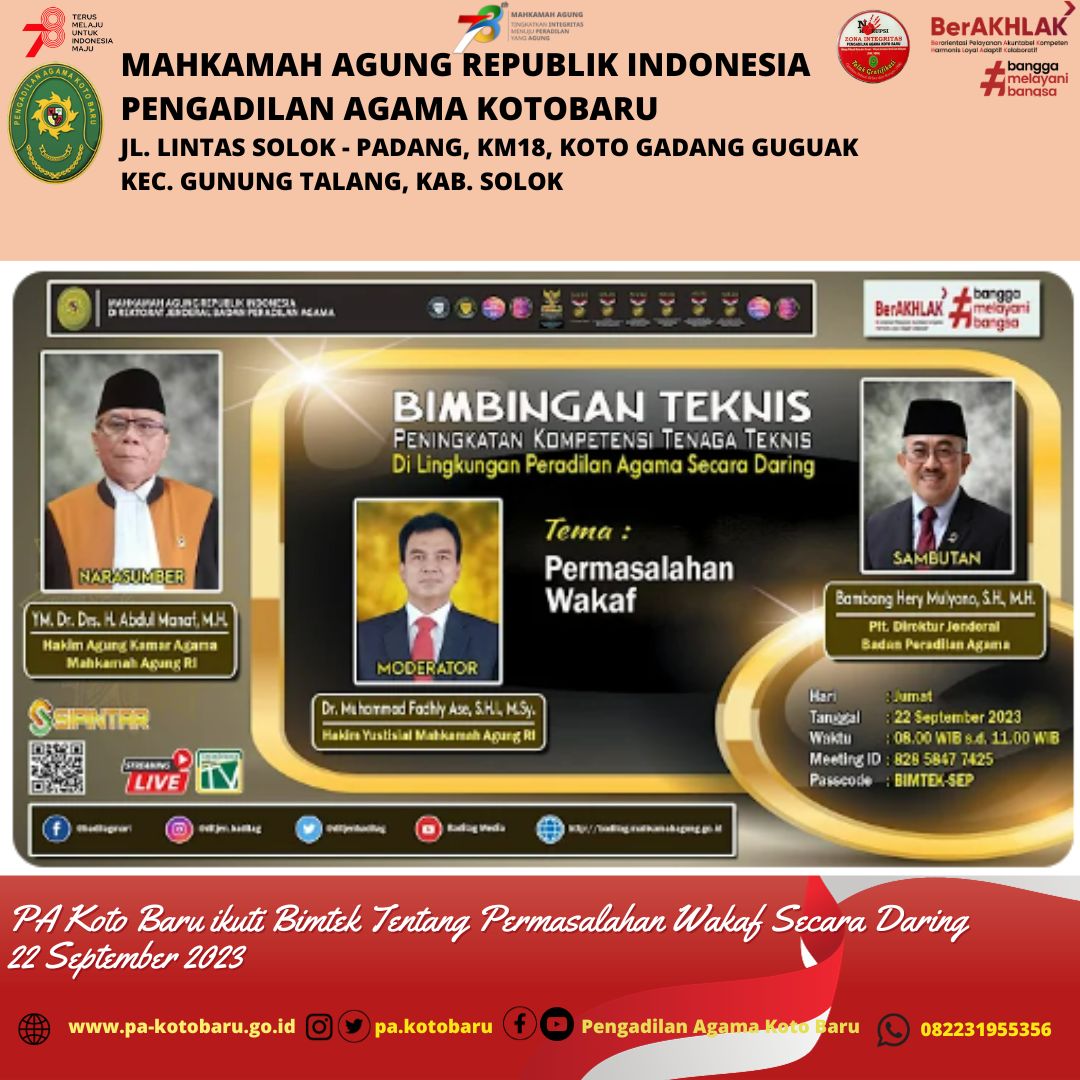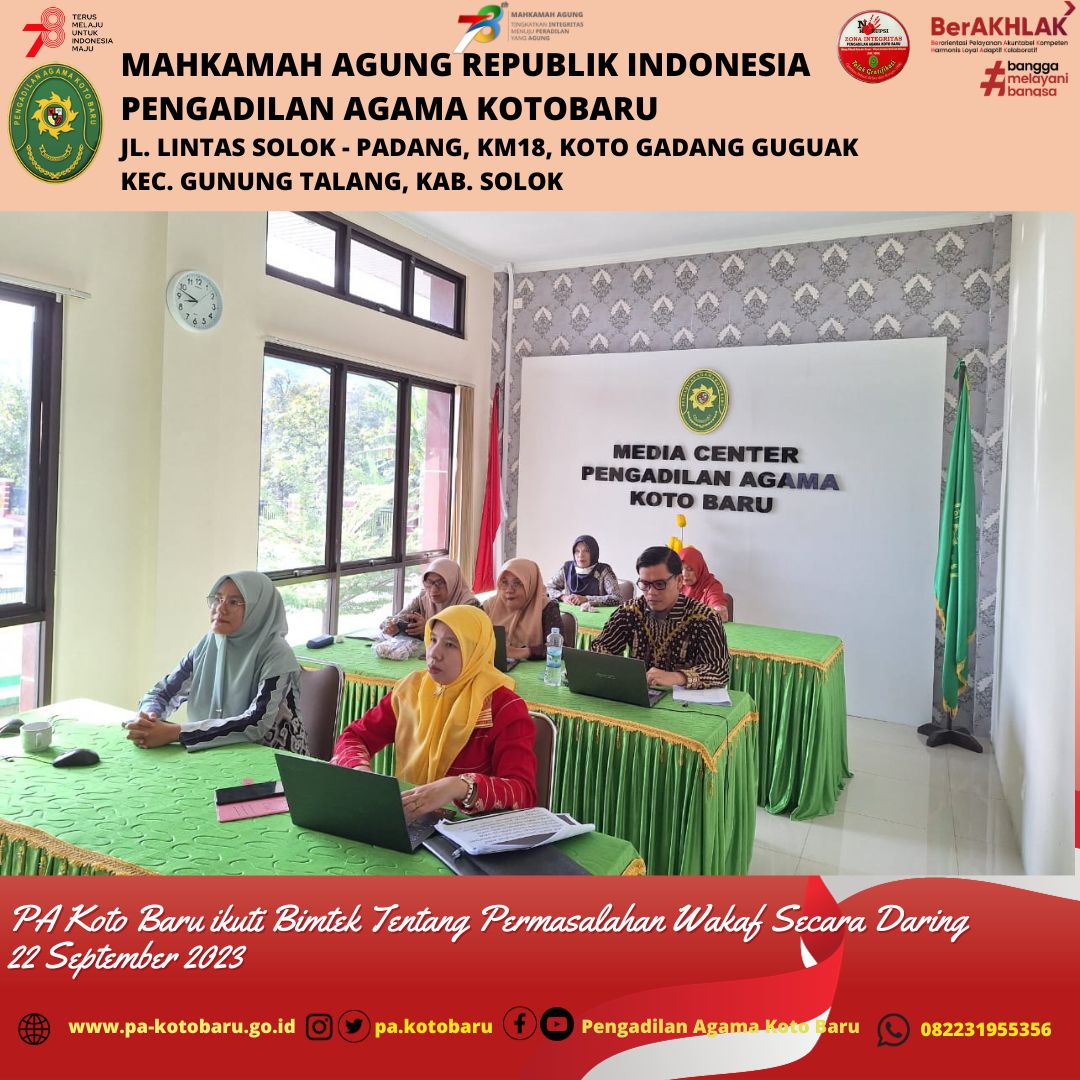 Koto Baru. (22/09/2023) Bertempat di Ruang Media Center Pengadilan Agama Koto Baru, Ketua, Wakil Ketua, Hakim serta Bagian Kepaniteraan mengikuti kegiatan Bimbingan Teknis dalam Rangka Peningkatan Kompetensi Tenaga Teknis di Lingkungan Peradilan Agama Secara Daring yang diselenggarakan oleh Direktorat Jenderal Badan Peradilan Agama. Kegiatan yang dimulai pada pukul 08.30 WIB ini dibuka dengan menyanyikan lagu Kebangsaan Indonesia Raya dan Lagu Hymne Mahkamah Agung.