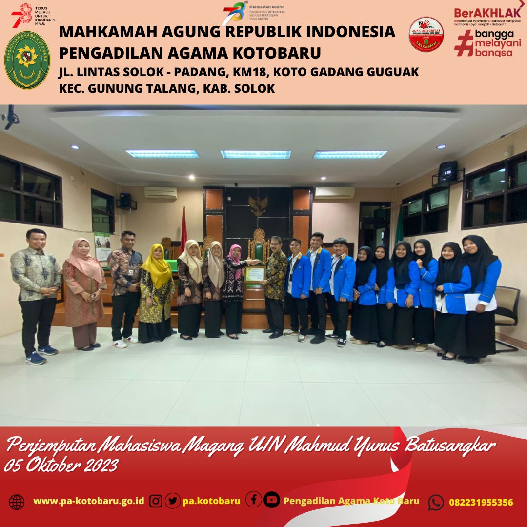 Dengan berakhirnya masa Magang di Pengadilan Agama Koto Baru Setelah lebih kurang 1 bulan melakukan Magang, tibalah saatnya 10 mahasiswa/i magang dari UIN Mahmud Yunus Batusangkar Prodi Hukum Tata Negara dijemput oleh dosen pembimbing dari Kampus UIN Mahmud Yunus Batusangkar.