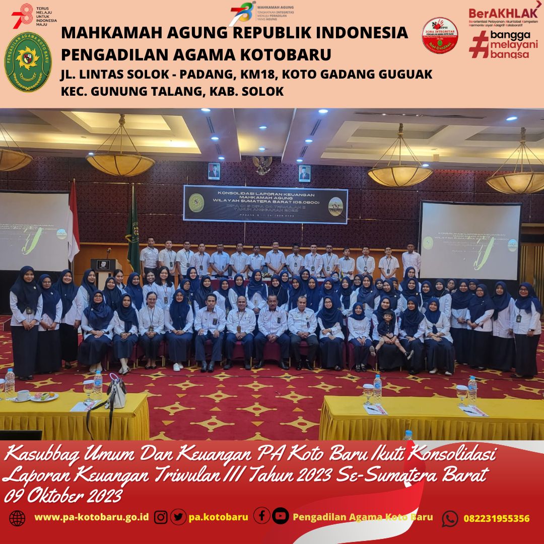Senin (09/10/23) Pengadilan Agama Koto Baru mengikuti Kegiatan Konsolidasi Laporan Keuangan Wilayah Sumatera Barat Triwulan III Tahun Anggaran 2023. Kegiatan ini diselenggarakan oleh Pengadilan Tinggi Agama Padang selama (3) tiga hari (Senin-Rabu/09-11 Oktober 2023) di Hotel Basko Padang. Kegiatan Konsolidasi ini diikuti olek Kasubbag Umum dan Keuangan Hasnur Rafiq, S.Kom dan Operator Wiwianto, S.Kom. Kegiatan Konsolidasi LK ini dibuka langsung oleh KPTA Sumatera Barat, YM Dr. Drs. Pelmizar, M.H.I.