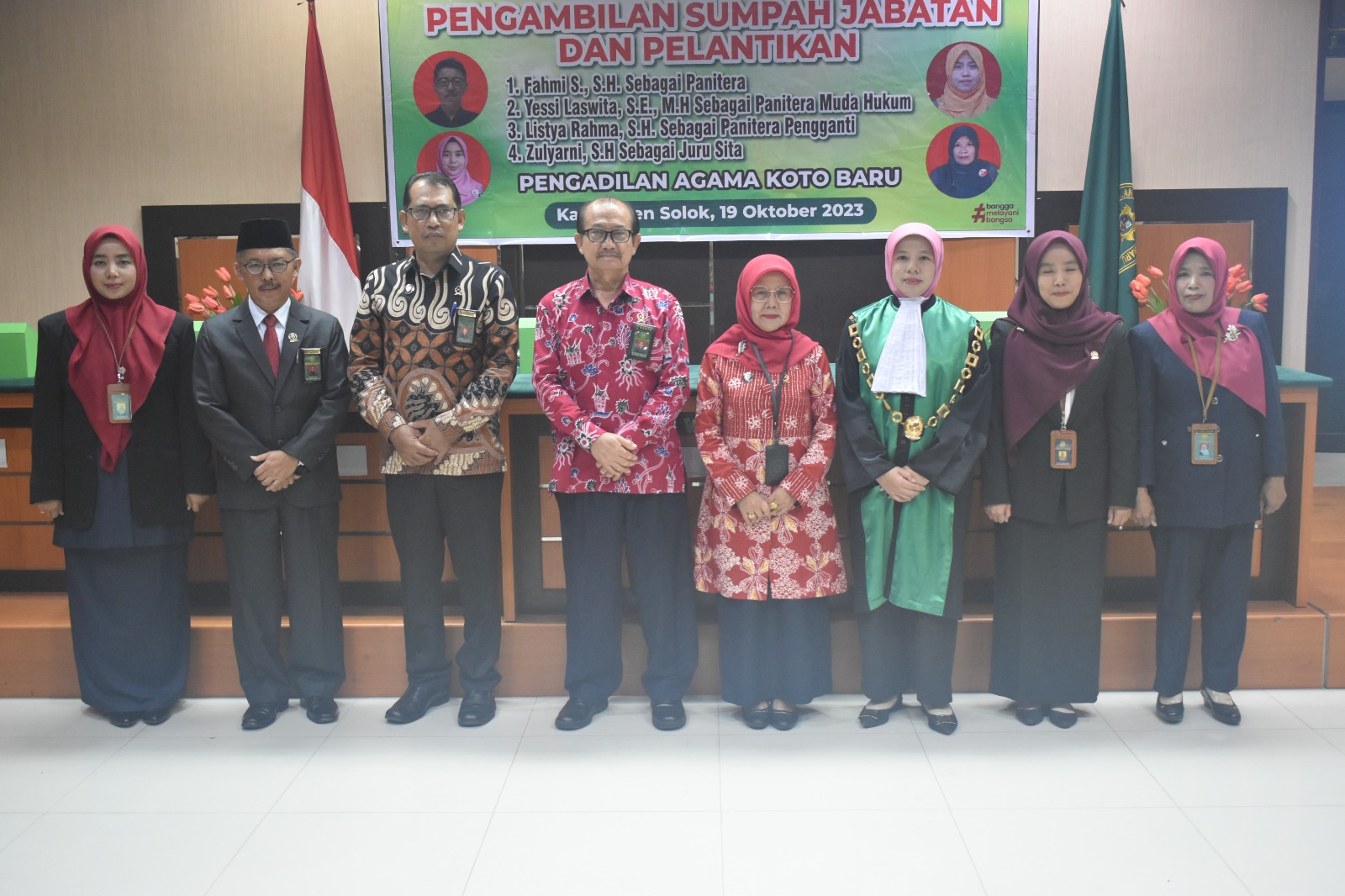 Koto Baru | Pada hari Kamis, 19 Oktober 2023 diselenggarakan acara Pengambilan Sumpah Jabatan dan Pelantikan Pejabat Kepaniteraan dan Kejurusitaan Pengadilan Agama Koto Baru.Yakni Bapak Fahmi, S, S.H sebagai Panitera PA Koto Baru, Ibu Yessi Laswita, S.E, M.H sebagai Panmud Hukum PA Koto Baru, Dan Ibu Listya Rahma, S.H sebagai Panitera Pengganti, serta Ibu Zulyarni, S.H sebagai Jurusita PA Koto Baru. Ibu Dr. Martina Lofa, S.HI, M.H. selaku Ketua Pengadilan Agama Koto Baru melantik Pejabat Kepaniteraan dan Kejurusitaan secara resmi di Ruang Sidang Pengadilan Agama Koto Baru. Pada pelantikan ini hadir seluruh Aparatur Pengadilan Agama Koto Baru baik Pejabat Struktural, Pejabat Fungsional, Pelaksana, PPNPN, . Selain itu hadir pula Ibu Dra. Hj. Rosliani, S.H, M.A. Wakil Ketua Pengadilan Tinggi Agama Padang, Ketua Pengadilan Agama Sawahlunto serta tamu undangan