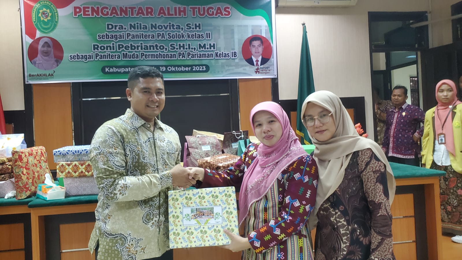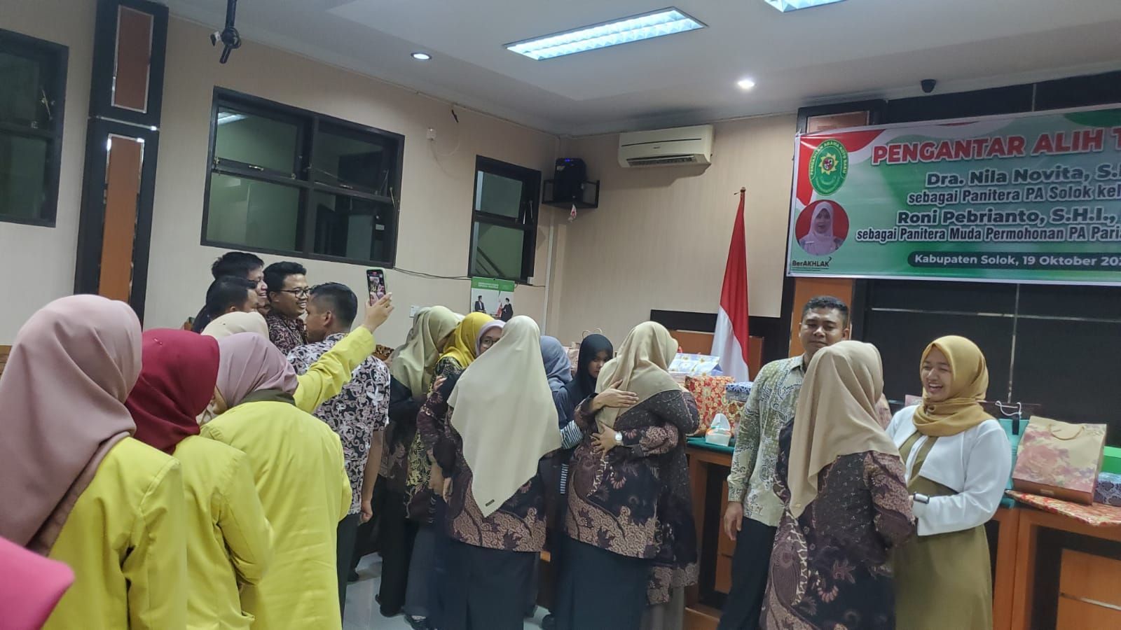 Dan Pada Hari Kamis, 19 Oktober 2023 di mulai Acara Pengantar Alih Tugas Ibu Dra. Nila Novita, S.H (Panitera PA Koto Baru), Bapak Roni Pebrianto, S.HI, M.H (Panmud Hukum PA Koto Baru) yang promosi dan mutasi menjadi Panitera PA Solok dan Panmud Permohonan PA Pariaman Kelas IB.