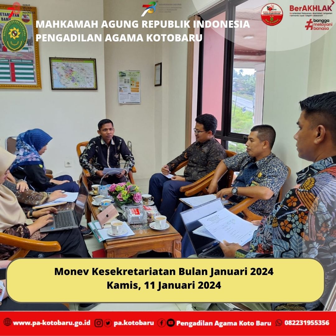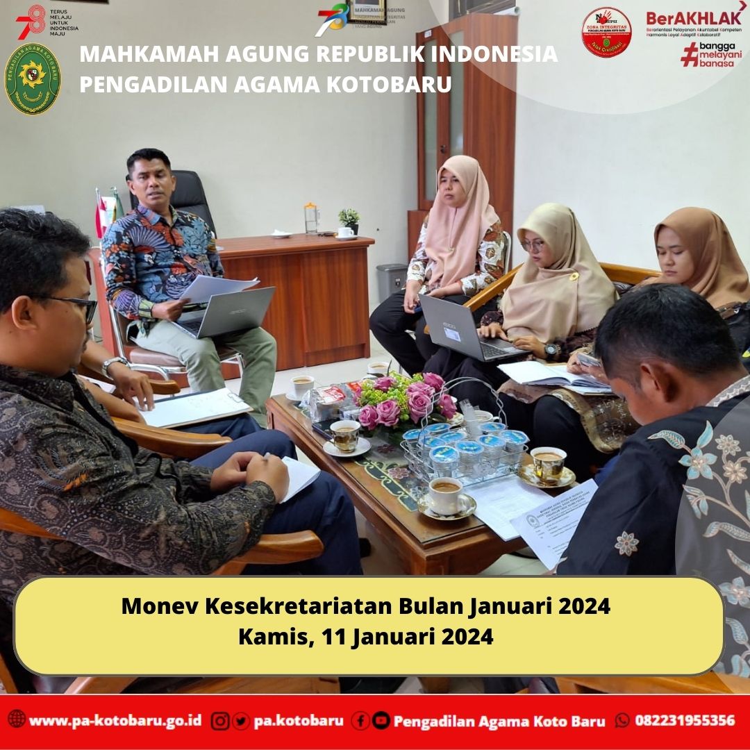Kegiatan Monitoring dan Evaluasi atau biasa disebut sebagai Monev merupakan kegiatan yang dilakukan seluruh bagian di Pengadilan Agama Koto Baru secara berkala, tidak terkecuali bagian Kesekretariatan. Kegiatan Monev bagian Kesekretariatan Bulan Januari Tahun 2024 dilaksanakan pada Kamis,11 Januari 2024 bertempat di Ruang Sekretaris PA Koto Baru.