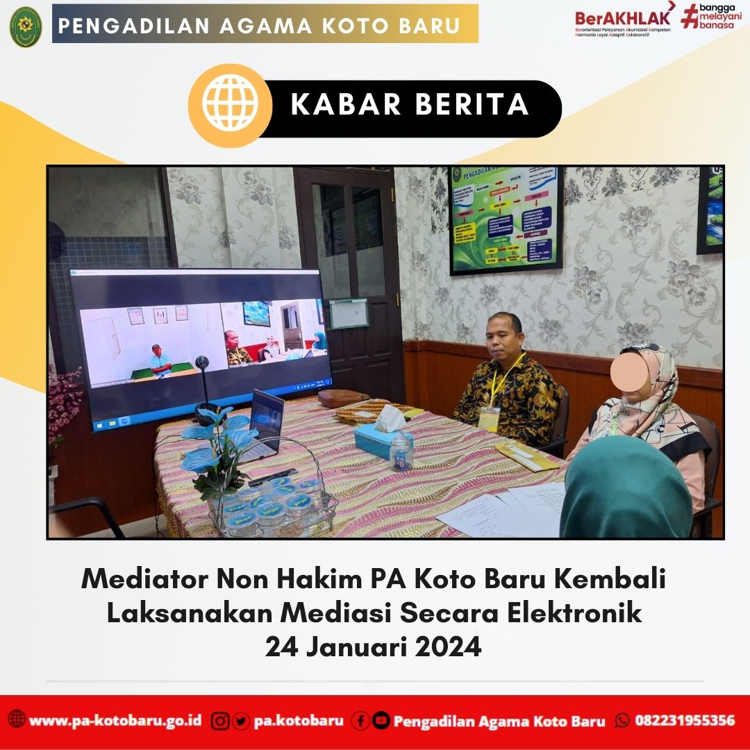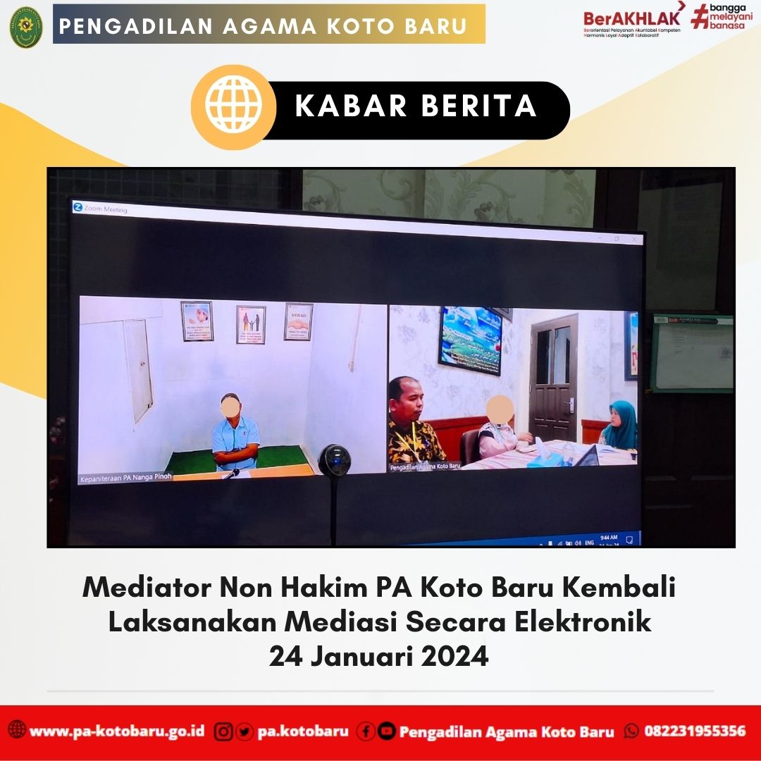 Mediator Non Hakim PA Koto Baru., Lusi Tania Agustin, S.Sos.I., M.Psi., CPM kembali melaksanakan mediasi secara elektronik terhadap perkara 6/Pdt.G/2024/PA.Kbr. Pihak Penggugat berdomisili di Pengadilan Agama Nanga Pinoh dan Pihak Tergugat berada di wilayah Pengadilan Agama Koto Baru