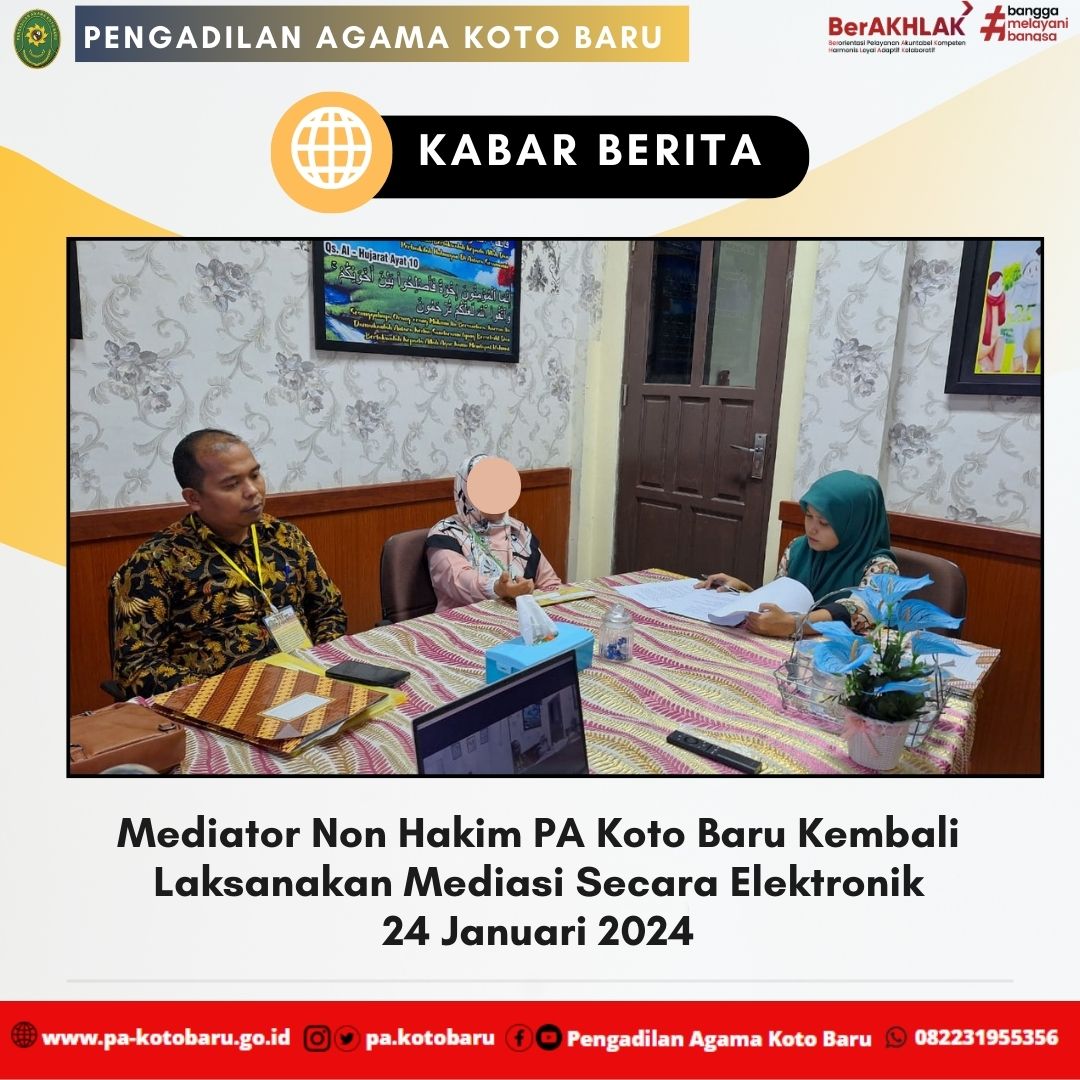 Mediasi dilakukan sesuai dengan ketentuan Perma Nomor 1 Tahun 2016 tentang Mediasi. Namun, pada perkara ini berbeda dengan mediasi lainnya karena mediasi dilakukan secara elektronik. Hal ini sangat mempermudah kegiatan mediasi dilaksanakan dengan mempertimbangkan kondisi pihak, termasuk dari segi jarak. Keberlangsungan mediasi secara elektronik ini sudah sering dilaksanakan di Pengadilan Agama Koto Baru. Terbenturnya jarak antara Penggugat dan Tergugat nyatanya tidak dijadikan penghambat oleh mediator non hakim untuk mengupayakan pertahanan dan keutuhan bahtera rumah tangga pasangan suami isteri terkait. Pelaksanaan mediasi via video teleconference ini dilakukan di PA Koto Baru pasca terbitnya Peraturan Mahkamah Agung Nomor 3 Tahun 2022 tentang Mediasi di Pengadilan Secara Eektronik.