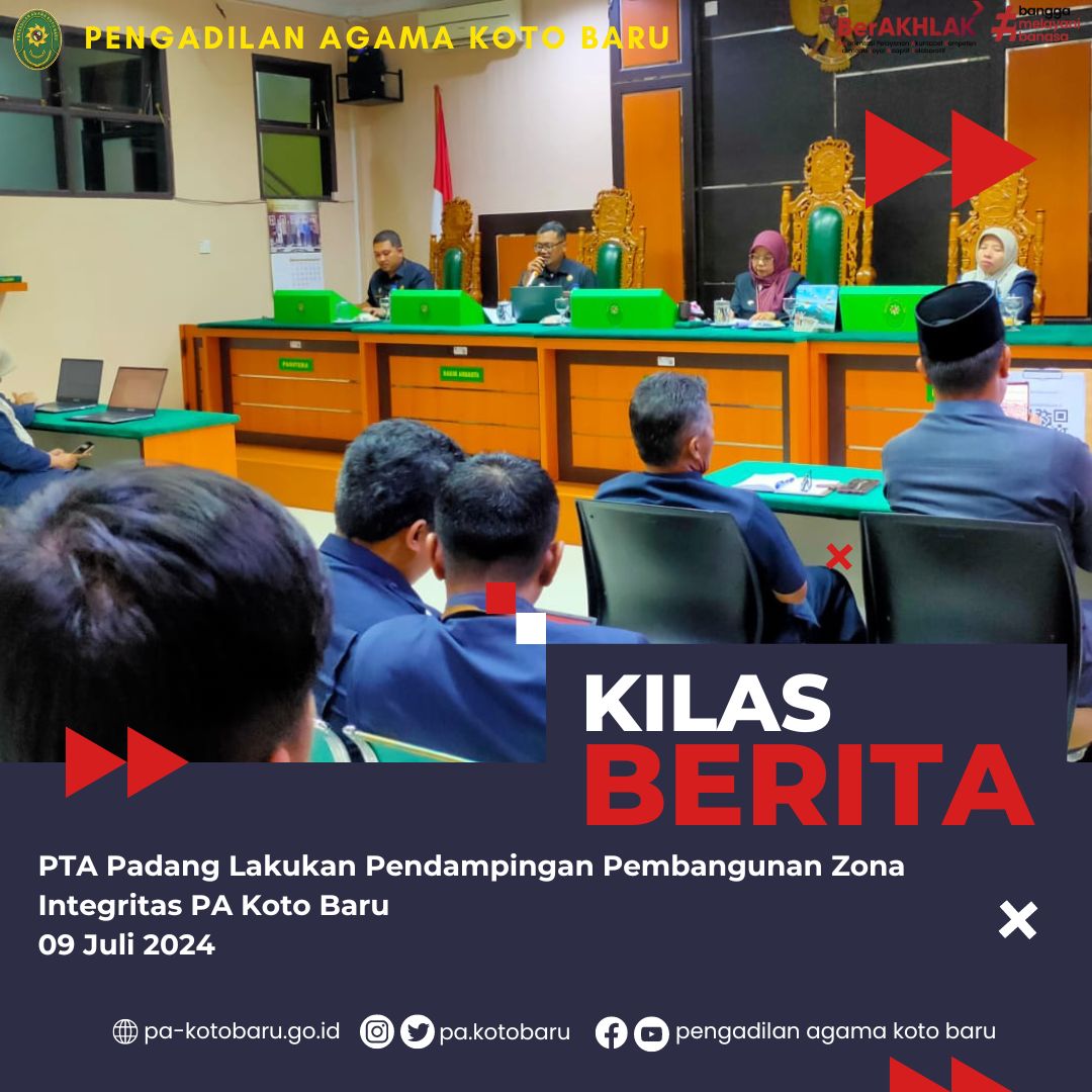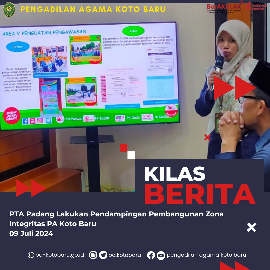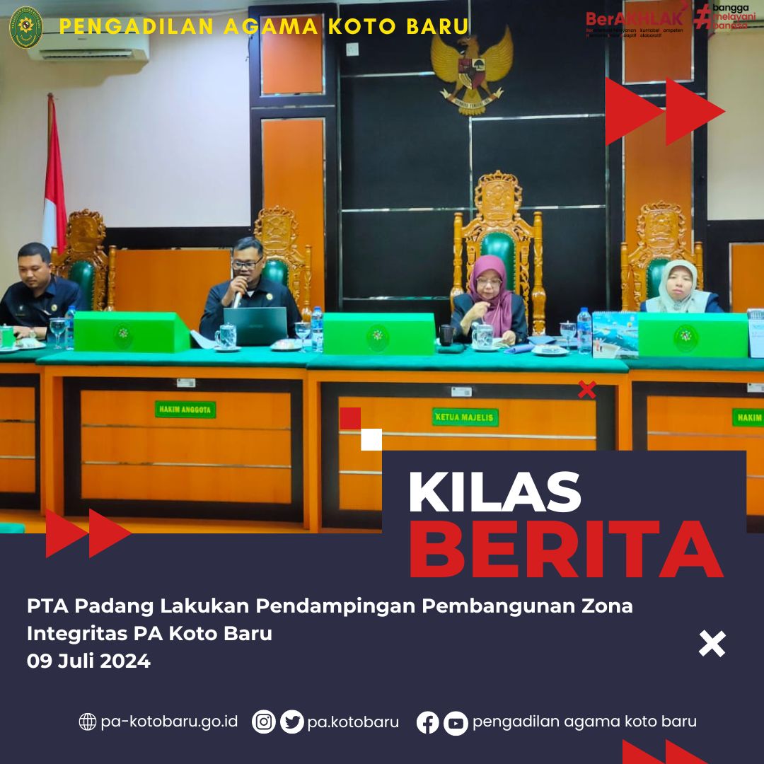 Selasa, 09 Juli 2024 Wakil Ketua PTA Padang, Dra. Hj. Rosliani, S.H., M.A.. bersama Tim , Kepala Bagian Perencanaan dan Kepegawaian, Mukhlis, S.H., Penata Layanan Operasional PTA Padang, Arya Jaya Shentika, S.H., melakukan kunjungan kerja ke PA Koto Baru dalam rangka Pendampingan Pembangunan Zona Integritas Menuju Wilayah Bebas dari Korupsi. Wakil Ketua PTA Padang bersama Tim disambut dengan semangat membara oleh Aparatur PA Koto Baru demi terwujudnya Wilayah Bebas dari Korupsi pada PA Koto Baru.