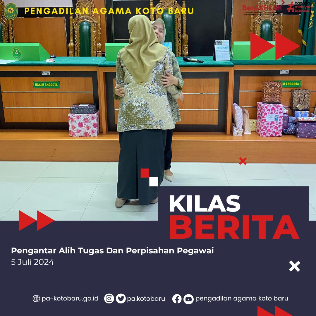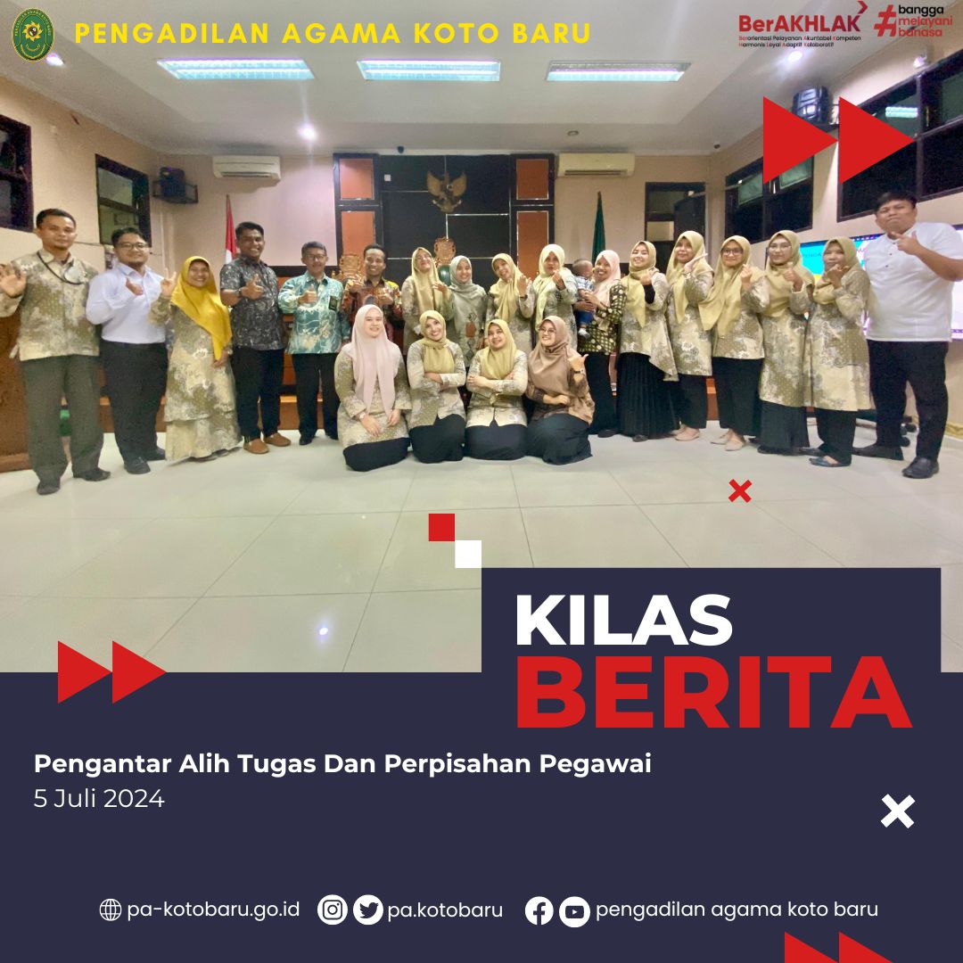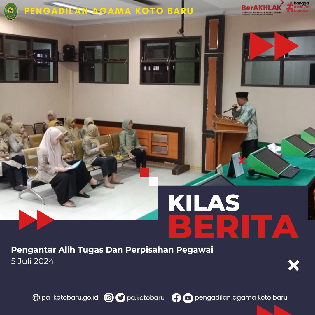 Koto Baru – Pengadilan Agama Koto Baru melaksanakan acara Pengantar Alih Tugas dan Perpisahan Pegawai bertempat di Ruang Sidang Utama pada hari Jum’at (05/07/2024) yang dimulai pada pukul 14.00 WIB. Acara ini dihadiri oleh segenap pegawai Pengadilan Agama Koto Baru.