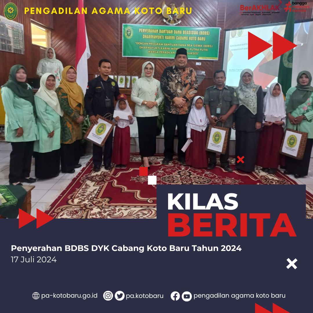 Rabu, 17 Juli 2024. Bertempat di Ruang Sidang Utama Pengadilan Negeri Koto Baru, Dharmayukti Karini Cabang Koto Baru melaksanakan kegiatan Penyerahan Bantuan Dana Beasiswa (BDBS) Dharmayukti Karini Cabang Koto Baru Tahun 2024. Penyerahan BDBS tahun ini mengusung tema ““Dengan Program Dana Beasiswa (BDBS) Dharmayukti Karini Mendukung Putra Putri Warga Peradilan Meraih Sukses”. ". Kegiatan tersebut dihadiri oleh Bapak Pelindung, seluruh pengurus dan anggota, serta siswa penerima BDBS Tahun 2024.