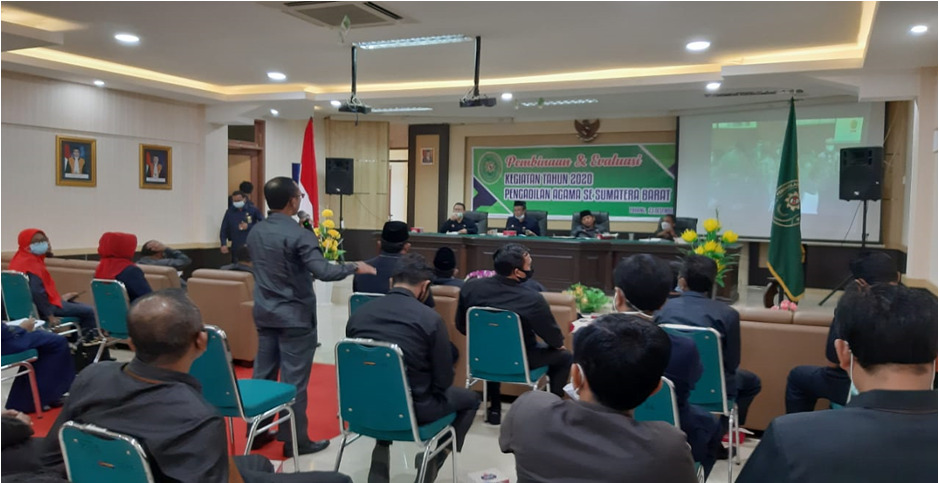 Padang, 23 Desember 2020. Pengadilan Tinggi Agama Padang melakukan pembinaan dan evalusi kegiatan tahun 2020 bertempat di ruang sidang utama Pengadilan Tinggi Agama Padang. Kegiatan dihadiri oleh seluruh Pengadilan Agama yang berada di wilayah Pengadilan Tinggi Agama Padang termasuk di dalamnya Pengadilan Agama Koto Baru yang berlokasi di Kabupaten Solok, dalam kesempatan ini diwakili oleh Indra Fitriadi (Ketua Pengadilan Agama Koto Baru) dan Suryarisman (Sekretaris Pengadilan Agama Koto Baru). Kegiatan yang dimaksud berlangsung dengan menerapkan protokol kesehatan.