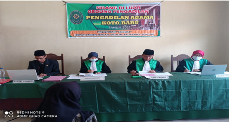 Ketua Pengadilan Agama Koto Baru, Indra Fitriadi, S.Ag.,M.Ag sebagai Hakim Ketua didampingi oleh Dyna Mardiah A,S.H.I dan Azimar Syamsi, S.H.I masing-masing Hakim Anggota serta dibantu oleh Embrizal, S.H.I sebagai Panitera Pengganti dalam pelaksanaan Sidang diluar Gedung Pengadilan di Balai Sidang Alahan Panjang, Kamis tanggal 03 Juni 2021 bertepatan dengan 22 Syawal 1442 Hijriah.