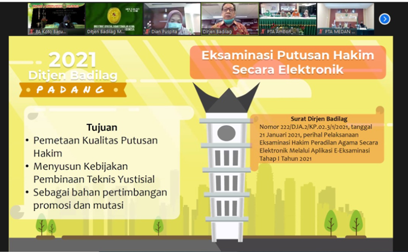 - Eksaminasi putusan hakim secara elektronik yang bertujuan untuk pemetaan kualitas putusan hakim, penyusunan kebijakan pembinaan teknis yustisial dan sebagai bahan pertimbangan promosi dan mutasi.