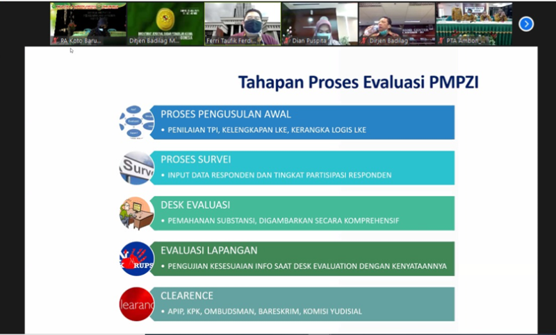 Selanjutnya, narasumber Bawas Mahkamah Agung RI Bapak Ferri Taufik Ferdiansyah, SE., Ak., M.Ak., CA., CFrA., meyampaikan tahapan proses evaluasi PMPZI, yaitu: