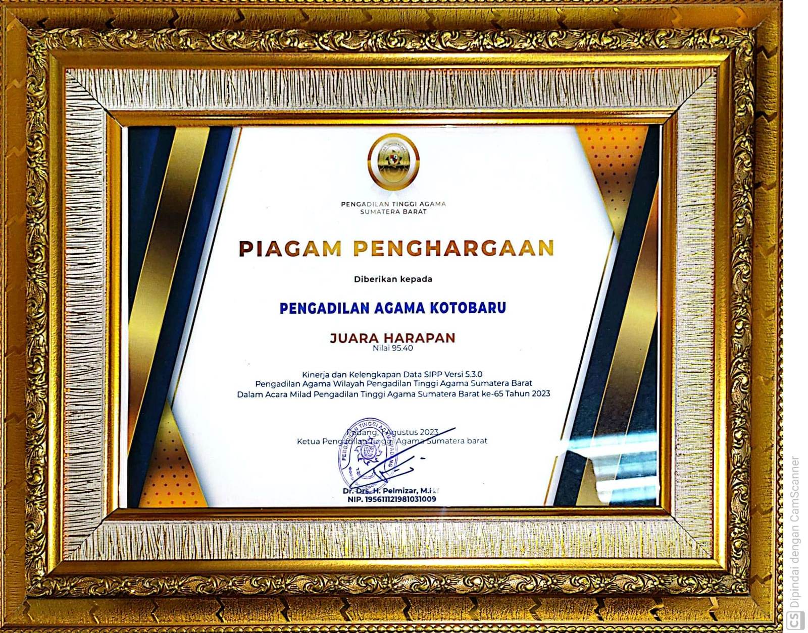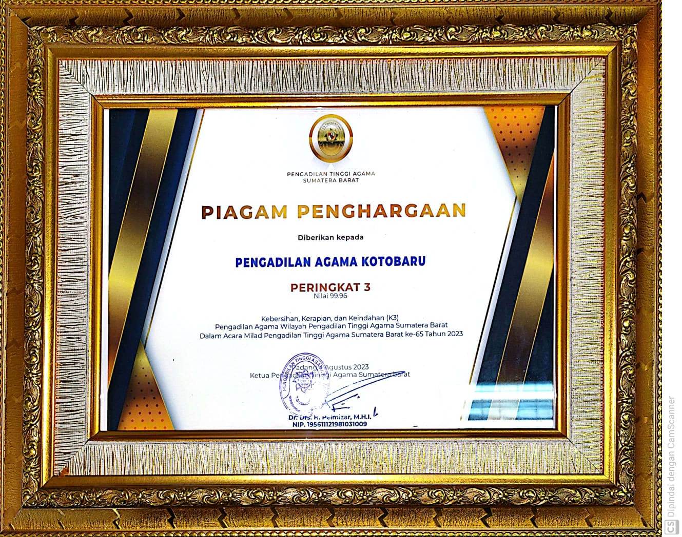 Pengadilan Agama Koto Baru menerima 2 Penghargaan yakni Peringkat 3 Kategori Kebersihan, Kerapian, dan Keindahan (K3) Pengadilan Agama Wilayah Sumatera Barat dengan Nilai 99,96. Dan Juara Harapan Kategori Kinerja dan Kelengkapan Data SIPP Versi 5.3.0 Pengadilan Agama Wilayah Sumatera Barat dengan Nilai 95,40. Penghargaan ini diberikan Pengadilan Tinggi Agama Sumatera Barat, sebagaimana tertuang dalam Piagam tertanggal 1 Agustus 2023 yang ditandatangani oleh Bapak Dr. Drs. H. Pelmizar, M.H.I., selaku Ketua Pengadilan Tinggi Agama Sumatera Barat dan diterima oleh Ketua  Pengadilan Agama Koto Baru Ibu Dr. Martina Lofa, S.HI, M.HI.