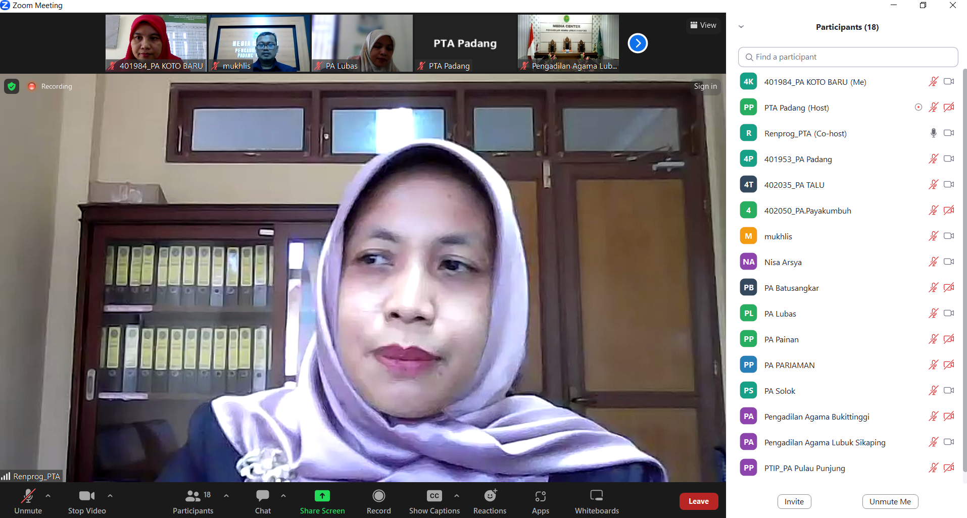 Acara dimulai pukul 10.00 WIB, Kabag Perencanaan dan Kepegawaian PTA Padang Bapak Muklis, S,H membuka Kegiatan sosialisasi ini secara daring, dalam pemaparannya beliau menjelaskan bahwa aplikasi tersebut merupakan aplikasi dari bawas yang baru dilaunching sehingga PTA Padang baru bisa menyiapkan acara zoom meeting kepada satker tingkat pertama. Aplikasi SEMAR berfungsi untuk Evaluasi dan dan Penilaian Akuntabilitas Kinerja. Dengan adanya aplikasi ini diharapkan Penyusunan SAKIP Satker lebih terarah dan sesuai dengan peraturan. SAKIP satker merupakan wadah bagi setiap Satker dalam menunjukan kinerja dan inovasi yang telah dilaksanakan. Selain itu SAKIP sangat berperan dalam pengusulan Zona Integritas Satker.