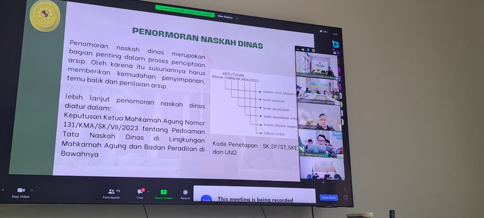Jumat, 08 Agustus 2023, pukul 09.00 WIB sesuai Surat Undangan Plt. Sekretaris Mahkamah Agung RI Nomor 1345/SEK/HK1.2.5/7/2023 tanggal 27 Juli 2023, Panitera Dra. Nila Novita beserta jajaran dan Sekretaris, Fauzan Putra, S.Kom beserta jajaran mengikuti kegiatan sosialisasi Surat Keputusan Ketua Mahkamah Agung tentang Tata Naskah Dinas di lingkungan Mahkamah Agung dan Peradilan yang ada di bawahnya. Kegiatan yang dilaksanakan secara virtual melalui zoom meeting.