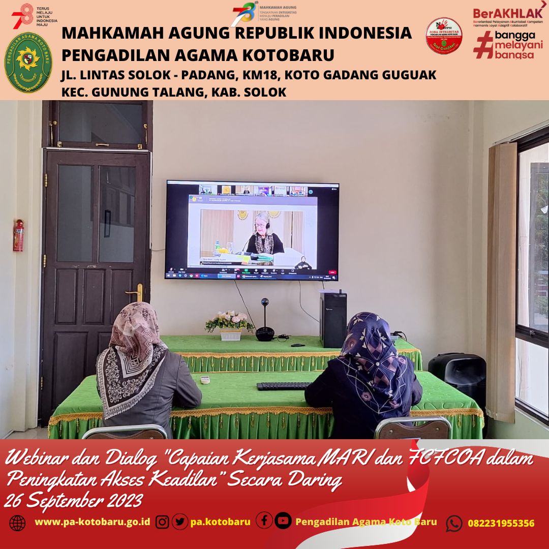 Koto Baru (26/9) –Mahkamah Agung Republik Indonesia bekerjasama dengan Family Court of Australia (FCoA) yang difasilitasi oleh Australia-Indonesia Partnership for Justice 2 (AIPJ2) menyelenggarakan Webinar dan dialog dengan topik  "Capaian Kerjasama MARI dan FCFCOA dalam Peningkatan Akses Keadilan" pada Selasa, 26 September 2023 pukul 13.30-16.30 WIB melalui zoom meeting.