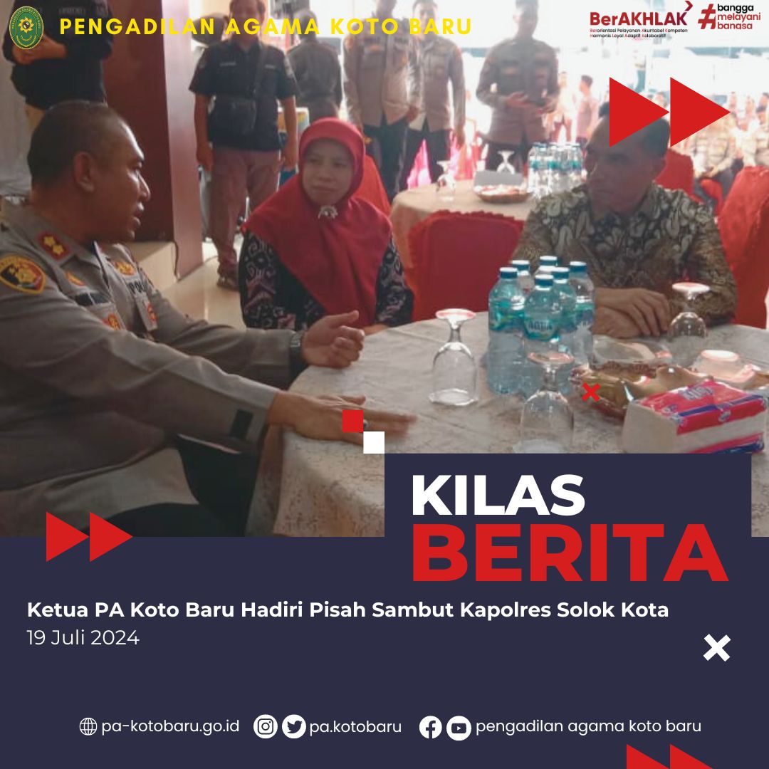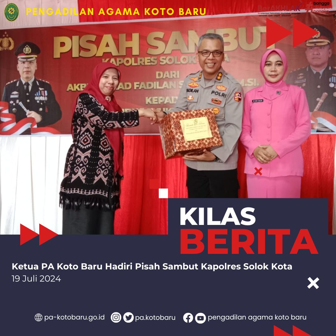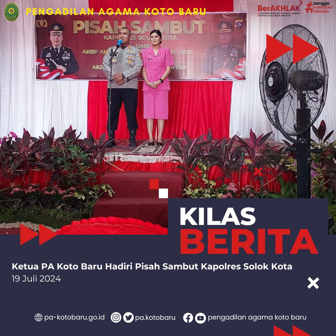 Ketua Pengadilan Agama Koto Baru, Dr, Martina Lofa, S.HI, M.HI, menghadiri acara silaturahmi dan pisah sambut Kapolres Solok Kota (Jum’at, 19/7/2024). Kapolres Solok Kota yang lama AKBP Ahmad Fadhilan, S.Si, M.Sc, M.Si digantikan oleh AKBP Abdus Syukur Felani, S.I.K.. Acara tersebut dihelat di Aula terbuka Comand Center Polres Solok Kota.