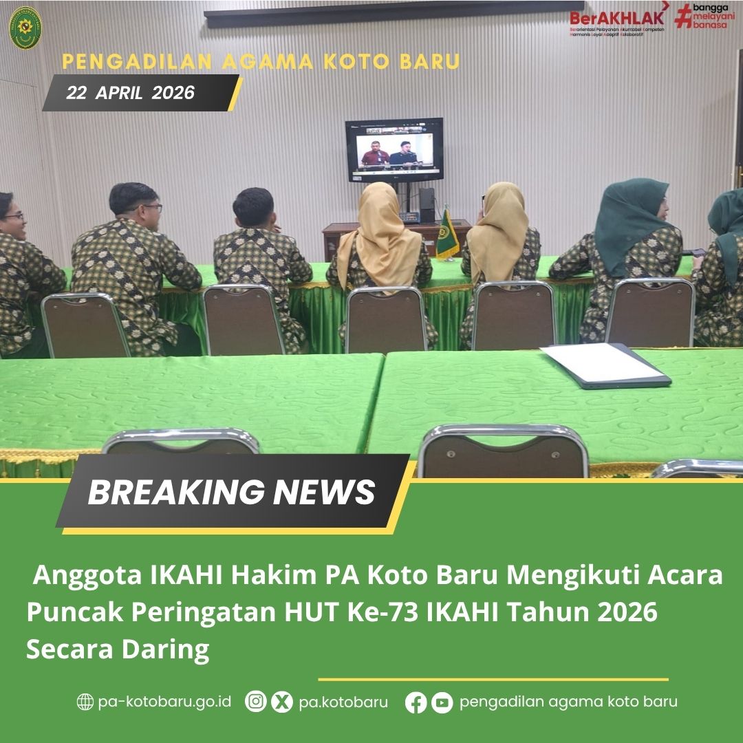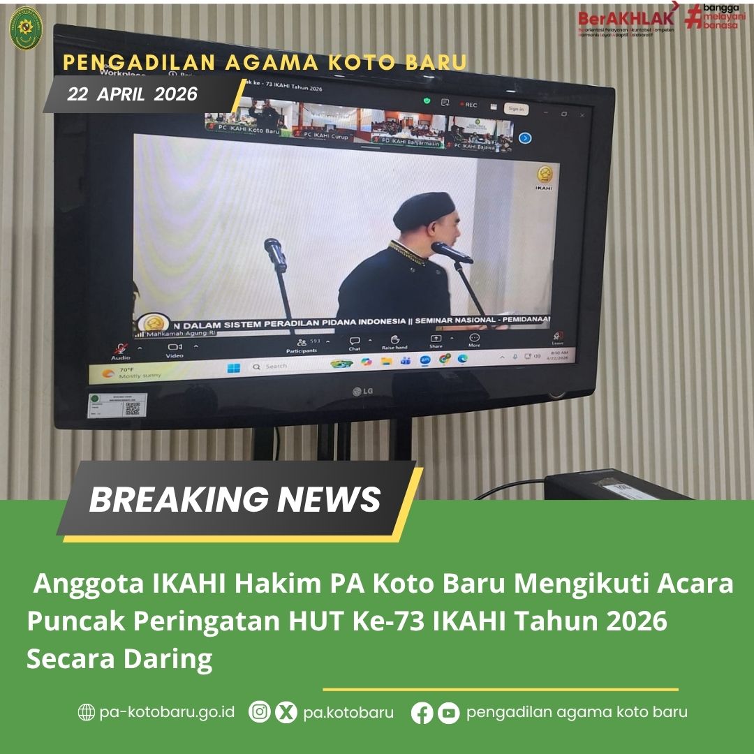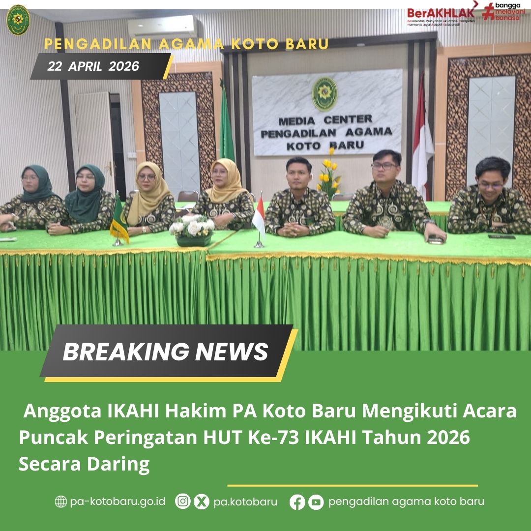 Anggota Ikatan Hakim Indonesia dari Pengadilan Agama Koto Baru mengikuti acara puncak peringatan Hari Ulang Tahun (HUT) ke-73 IKAHI Tahun 2026 yang diselenggarakan secara daring. Kegiatan ini merupakan bagian dari rangkaian peringatan nasional yang diikuti oleh seluruh hakim di Indonesia sebagai bentuk kebersamaan dan solidaritas dalam satu wadah organisasi profesi.