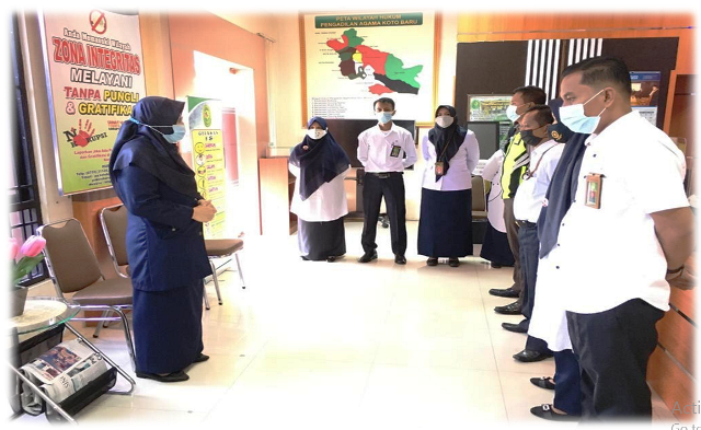 Bertempat di ruang PTSP Pengadilan Agama Koto Baru, briefing rutin petugas PTSP dan satpam dilaksanakan tepatnya setelah kegiatan apel pagi selesai. Ibu Rina Eka Fatma, S.H.I.,M.Ag selaku pimpinan Pengadilan Agama Koto Baru menyampaikan terkait beberapa hal penting yang harus diperhatikan oleh petugas PTSP dan Satpam, diantaranya sikap berintegritas dalam bekerja yang menjadi pondasi untuk membangun kepercayaan masyarakat yang membutuhkan pelayanan sehingga kedepannya terbangunlah rasa bertanggung jawab, jujur dalam setiap tindakan. Kemudian selalu terapkan instruksi dari ketua Mahkamah Agung untuk tetap menerapkan protokol kesehatan di lingkungan kerja karena aparatur peradilan agama menjadi contoh dan suri tauladan bagi keluarga, masyarakat dalam menerapkan protokoler kesehatan tersebut.