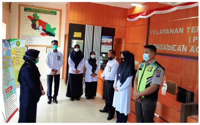 Pengadilan Agama Koto Baru, melaksanakan briefing petugas PTSP (Pelayanan Terpadu Satu Pintu) dan petugas keamanan. Pada kesempatan ini disampaikan oleh hakim Pengadilan Agama Koto Baru Ibu Alimah Aini, S.H.I yang juga didampingi oleh Panitera Muda Gugatan, Permohonan dan Hukum Pengadilan Agama Koto Baru. Briefing membahas tentang pelayanan kepada masyarakat di area PTSP. Keramahan petugas dan kondisi ruang PTSP yang bersih dan nyaman tentu menjadi penunjang pelayanan prima Bagi satpam/ petugas keamanan sebagai garda terdepan juga diminta agar meningkatkan kedisiplinan dalam memantau masyarakat yang berkunjung ke Pengadilan Agama Koto Baru. Pemakaian kalung identitas bagi pengunjung wajib dilaksanakan oleh petugas keamanan. Semoaga Pengadilan Agama Koto Baru menjadi lebih baik dimata masyarakat dan tentunya yang terpenting disisi Allah SWT.