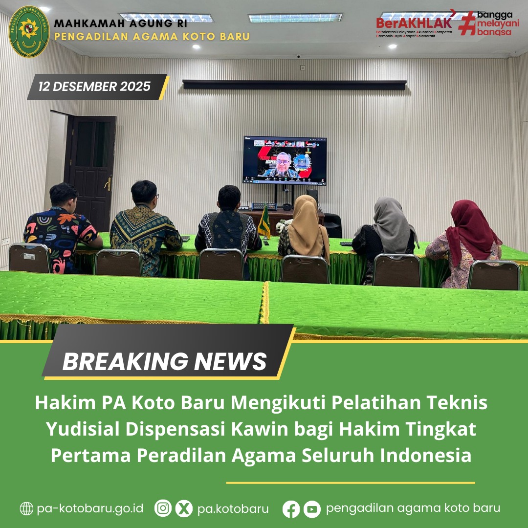 Pengadilan Agama Koto Baru terus berkomitmen dalam meningkatkan kualitas sumber daya manusia peradilan. Pada Jum’at, 12 Desember 2025, bertempat di Media Center Pengadilan Agama Koto Baru, sebanyak 6 (enam) Hakim Pratama, yaitu Adila Shabrina, S.H., Cici Arista Anwar, S.H., Hendra Rusliyadi, S.H., M. Ilham Azizul Haq, S.H., Septa Tri Sanjaya, S.H., dan Widiya Yusmar, S.H., M.H., mengikuti penutupan kegiatan Pelatihan Teknis Yudisial Dispensasi Kawin bagi Hakim Tingkat Pertama Peradilan Agama Seluruh Indonesia.