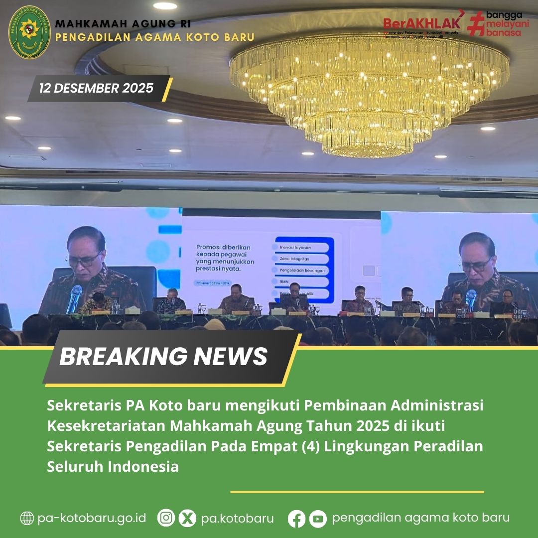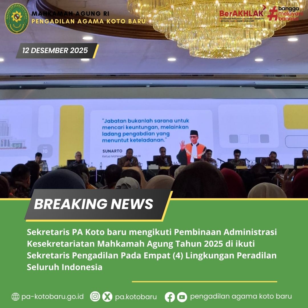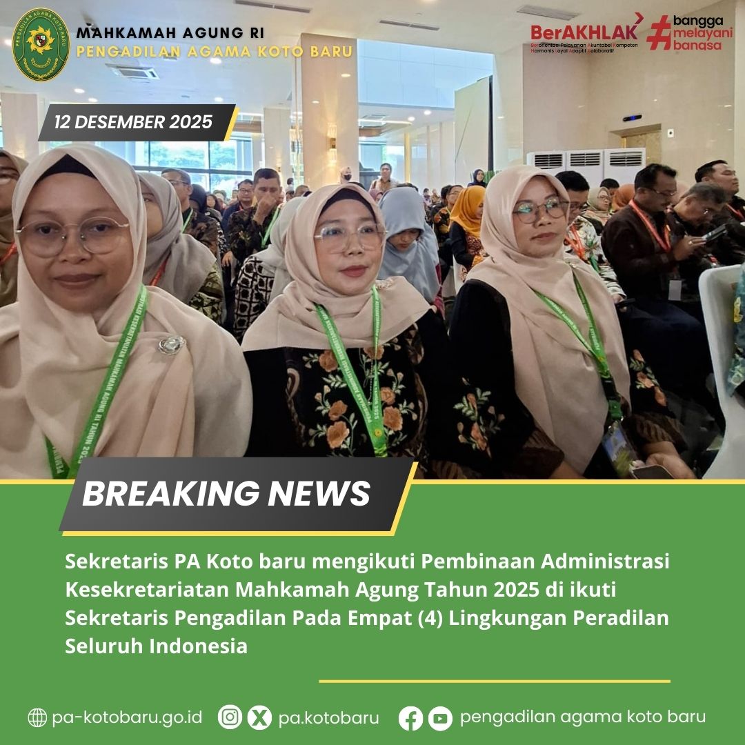 Koto Baru, 12 Desember 2025, Mahkamah Agung RI menyelenggarakan Pembinaan Administrasi Kesekretariatan Tahun 2025 bagi para Sekretaris Pengadilan pada empat lingkungan peradilan di seluruh Indonesia. Dan dihadiri oleh Ibu Sil Melayeni Agus, S.H. M.H. selaku Sekretaris Pengadilan Agama Koto Bar. Kegiatan ini menjadi momen penting untuk memperkuat tata kelola administrasi, meningkatkan profesionalisme aparatur, serta mendorong keseragaman standar pelayanan publik di seluruh satuan kerja. Melalui pembinaan ini, MA RI menegaskan komitmen untuk menghadirkan layanan peradilan yang lebih akuntabel, modern, dan responsif terhadap kebutuhan masyarakat.