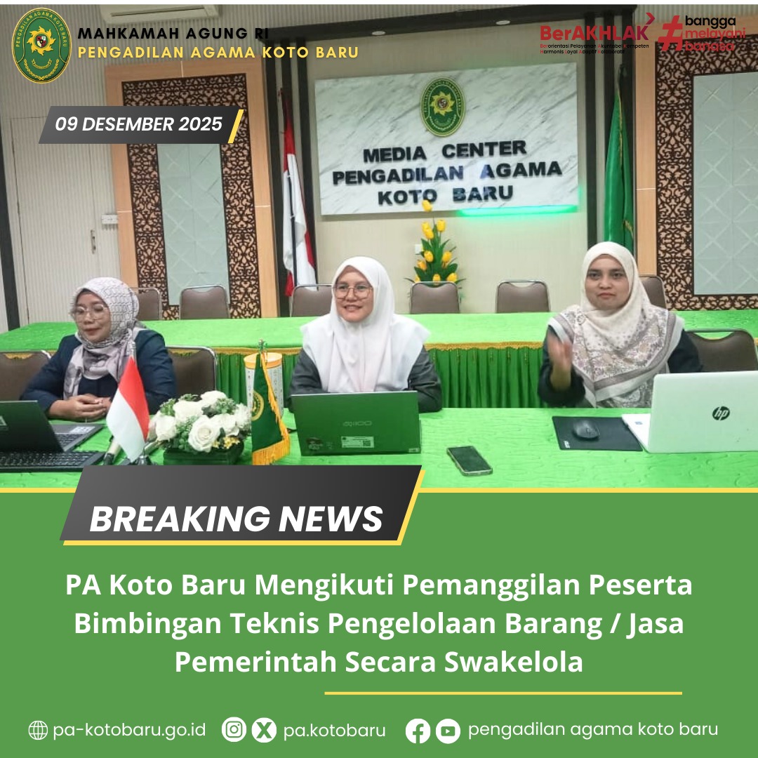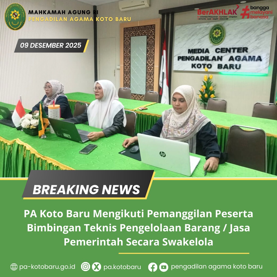 Kabupaten Solok - Selasa, 9 Desember 2025, Pengadilan Agama Koto Baru akan mengikuti Bimbingan Teknis (Bimtek) Pengelolaan Barang/Jasa Pemerintah Secara Swakelola melalui Zoom Meeting di Media Center satuan kerja.
