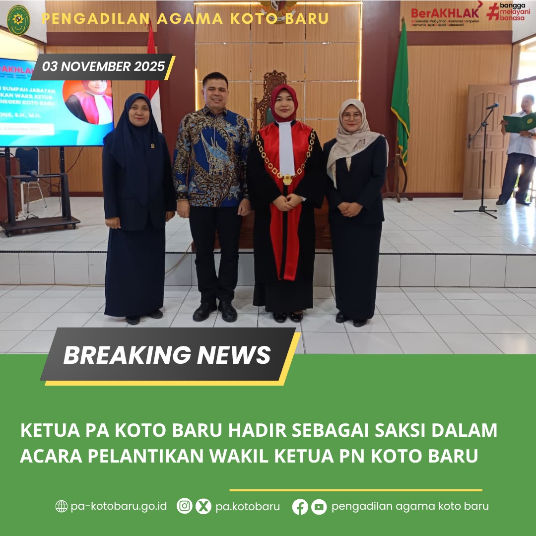 Ketua Pengadilan Agama Koto Baru, Nidaul Husni, S.H.I., M.H., menghadiri sekaligus menjadi saksi dalam acara Pengambilan Sumpah Jabatan dan Pelantikan Nartilona, S.H., M.H. sebagai Wakil Ketua Pengadilan Negeri Koto Baru.