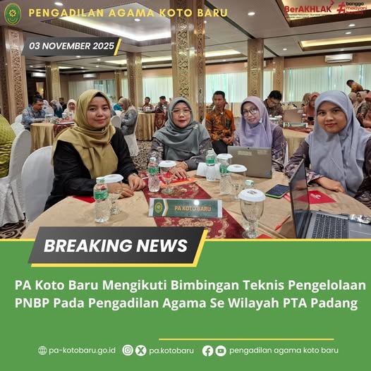Dalam rangka meningkatkan pemahaman dan keterampilan aparatur peradilan dalam mengelola Penerimaan Negara Bukan Pajak (PNBP), Pengadilan Tinggi Agama (PTA) Padang menyelenggarakan kegiatan Bimbingan Teknis (Bimtek) Pengelolaan PNBP. Kegiatan ini dilaksanakan berdasarkan Surat Undangan Nomor: 2509/KPTA.W3-A/DL1.10/X/2025, bertempat di Pangeran Beach Hotel Padang, dan berlangsung selama dua hari, yakni pada 3–4 November 2025. Bimtek ini diikuti oleh perwakilan dari seluruh satuan kerja Pengadilan Agama di wilayah hukum PTA Padang, termasuk dari Pengadilan Agama Koto Baru.