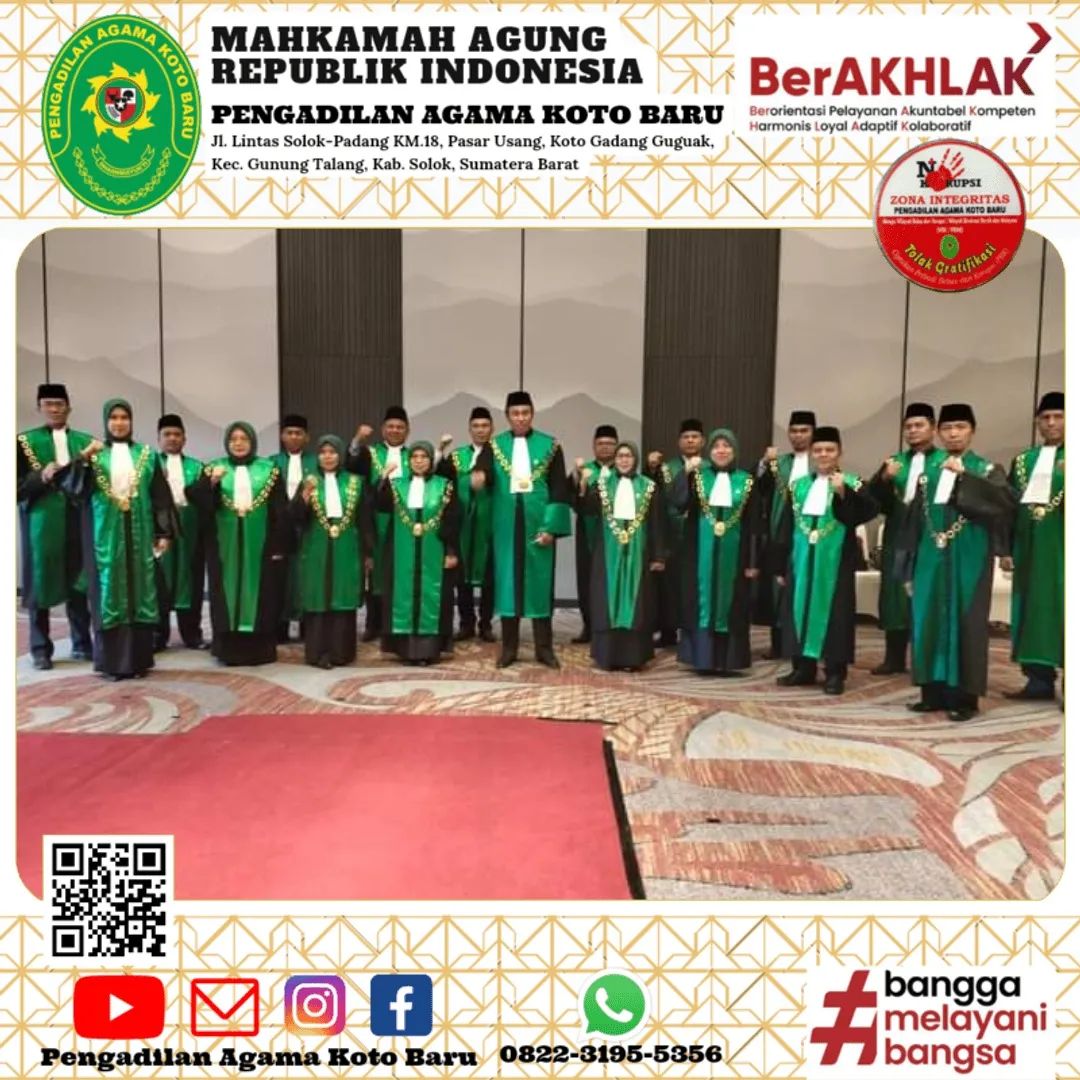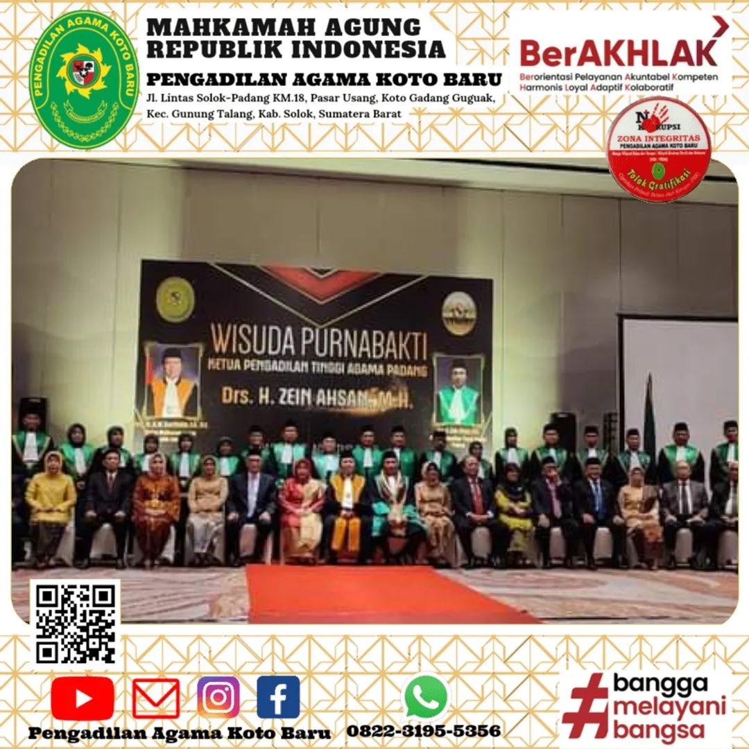 Ketua Pengadilan Agama Koto Baru Ibuk Rina Eka fatma, S.H.I., M.Ag, Wakil Ketua, Bapak Asyrof Syarifuddin, S.H.I, Panitera, Ibuk Dra. Nila , Novita, S.H, serta Sekretaris Bapak Paisul Batubara, S.Ag, menghadiri acara Wisuda Purna Bakti Ketua Pengadilan Tinggi Agama Padang. Acara tersebut dilaksanakan di Hotel Santika, kota Padang. Ketua Mahkamah Agung Republik Indonesia Yang Mulia Prof. Dr. H. M. Syarifuddin, S.H., M.H memimpin langsung acara tersebut. Yang Mulia Drs. Zein Ahsan, M.H. telah mengabdi selama 40 tahun di Ranah Peradilan dan sudah menjabat Ketua Pengadilan Tinggi Agama Padang sejak tahun 2019 silam.