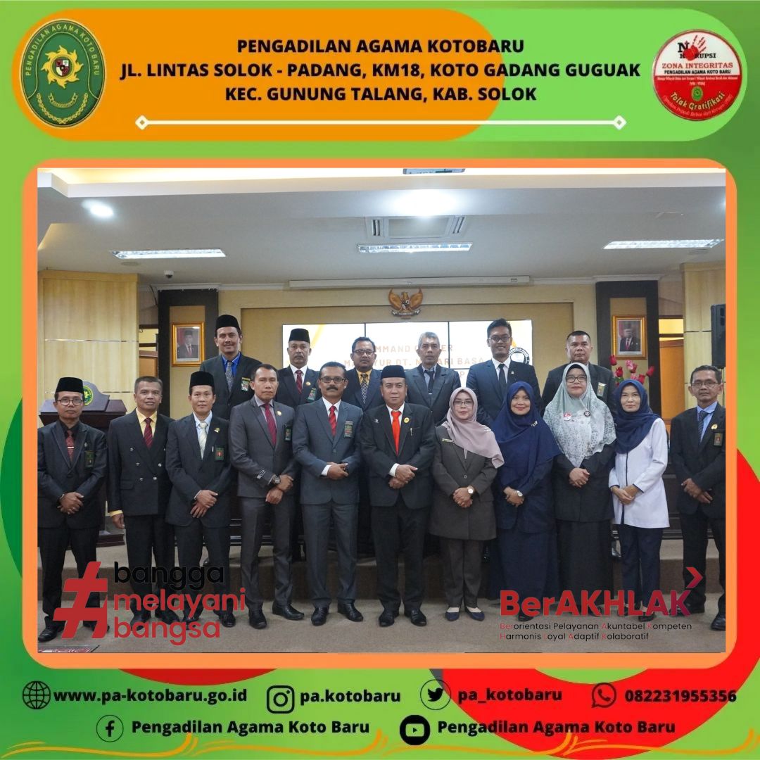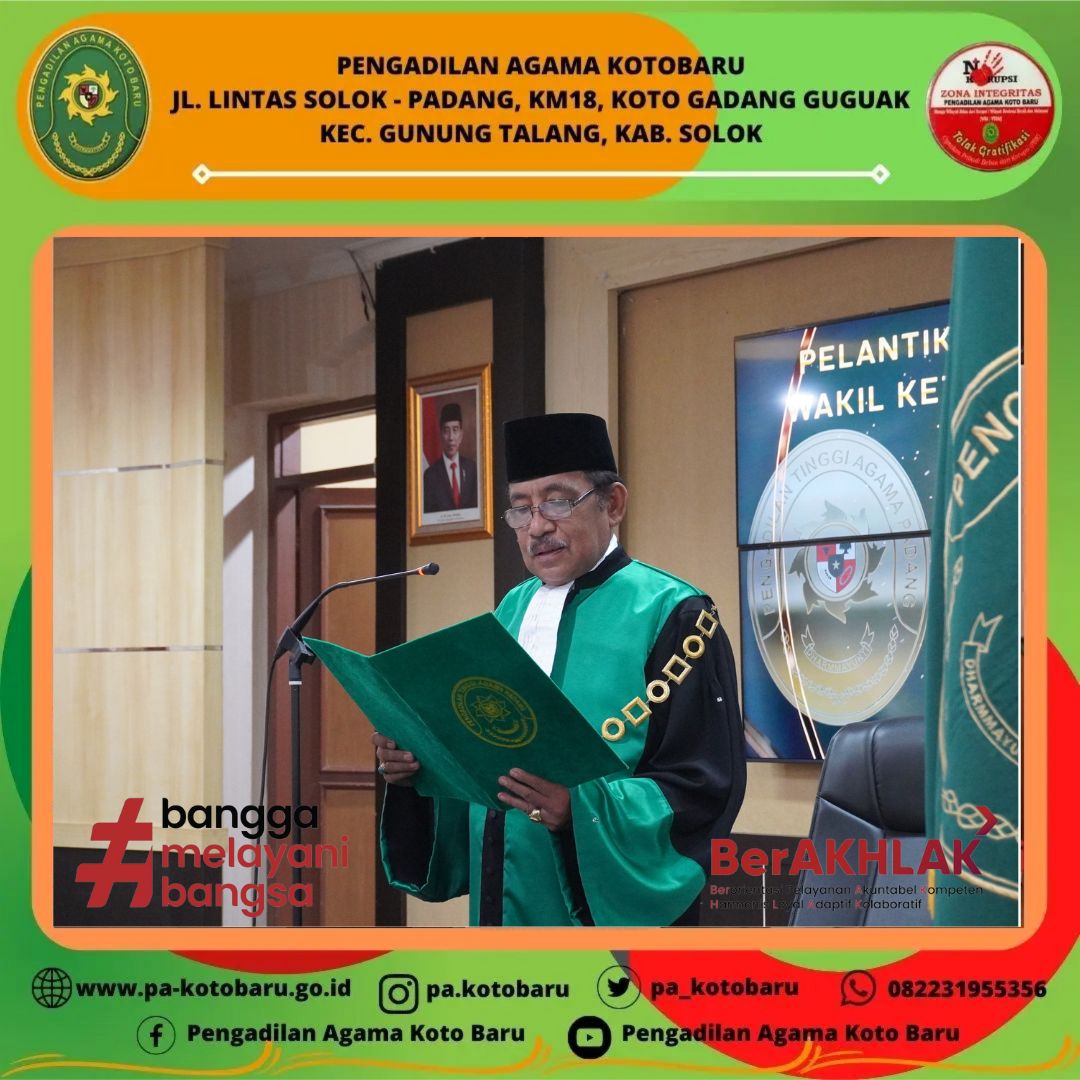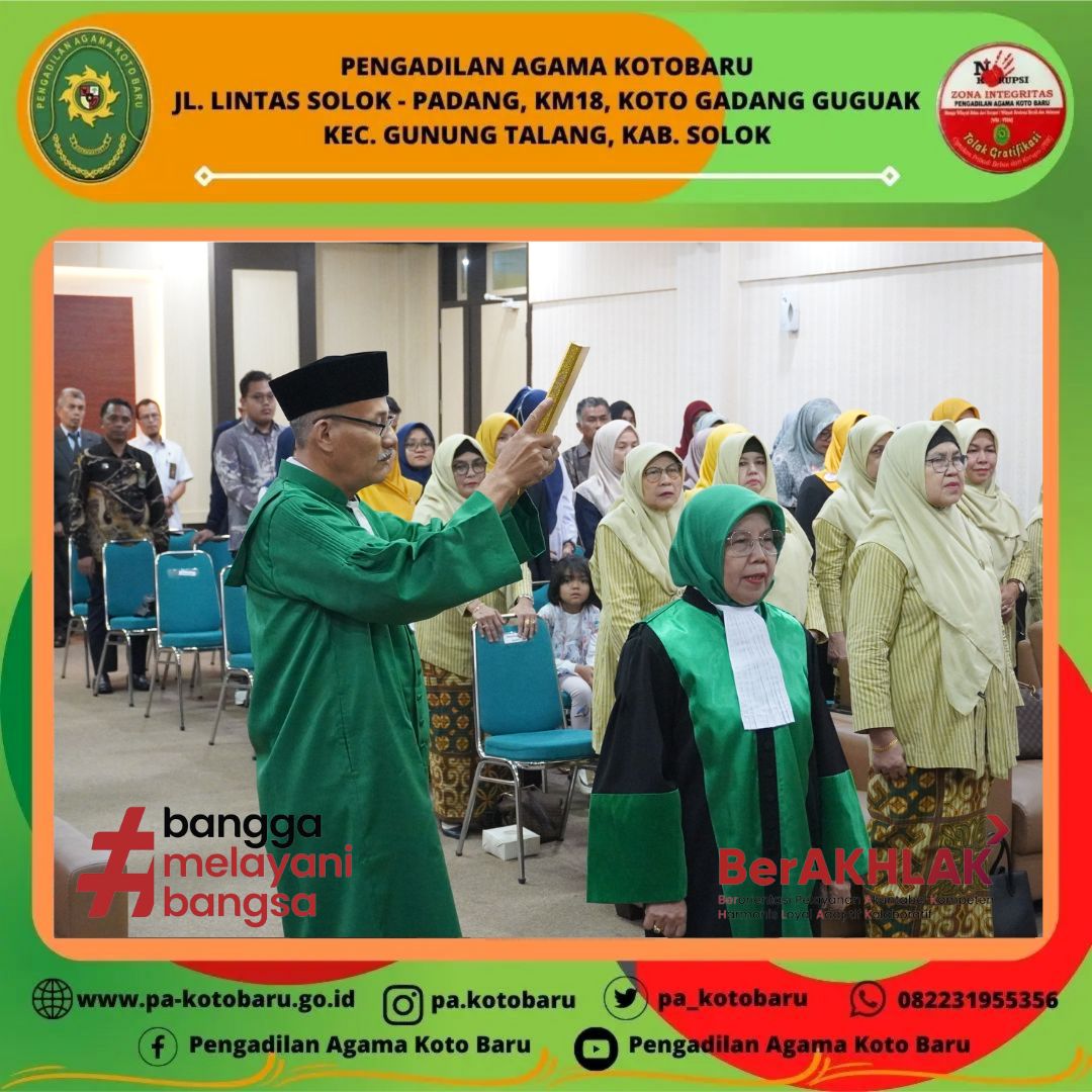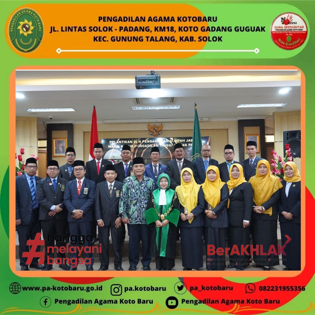 Wakil Ketua Pengadilan Agama Koto Baru Nidaul Husni, S.H.I, M.H serta didampingi oleh Panitera Dra. Nila Novita, S.H dan Sekretaris Fauzan Putra, S.Kom. menghadiri pelantikan dan pengambilan sumpah Wakil Ketua Pengadilan Tinggi Agama Padang, Dra. Hj. Rosliani, MA. di Ruang Aula PTA Padang.