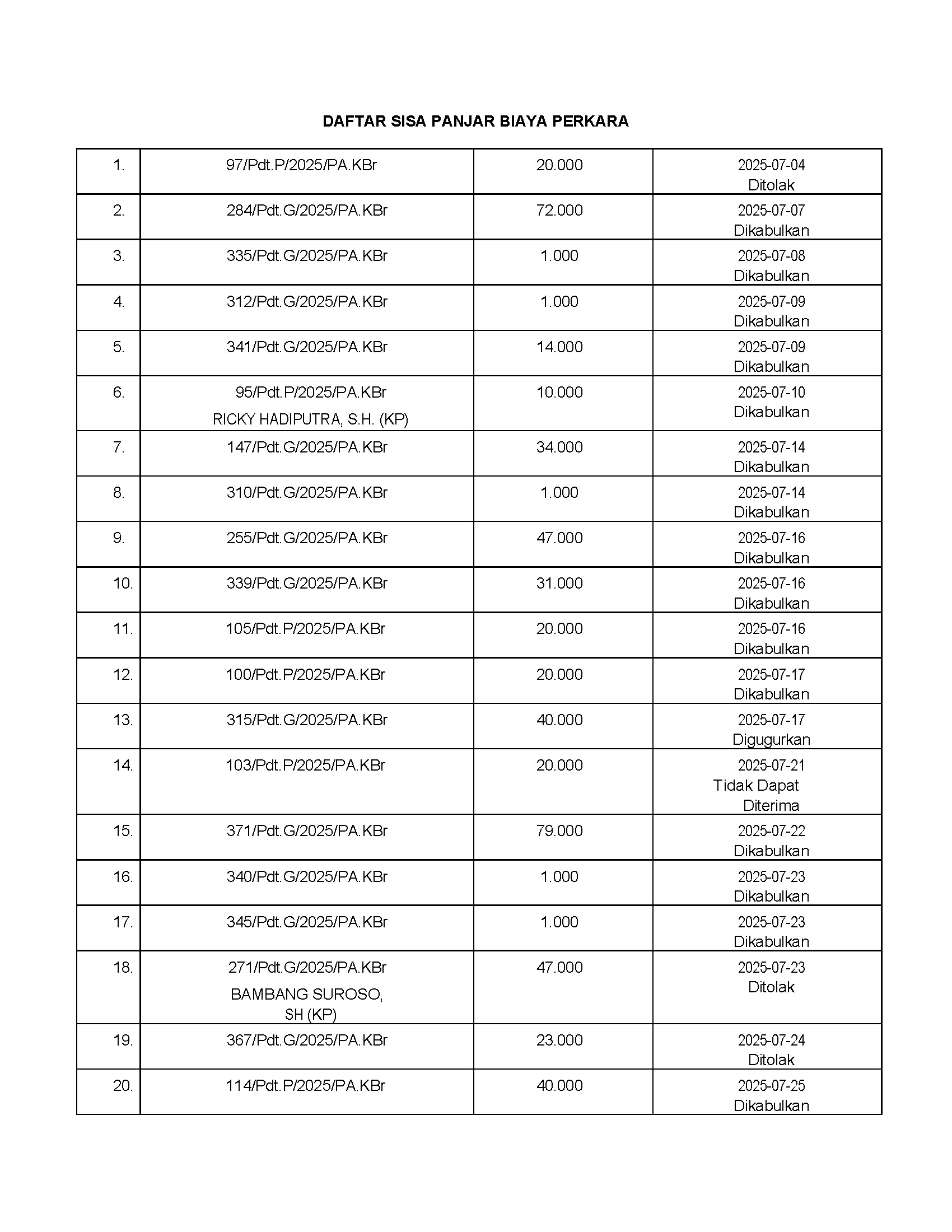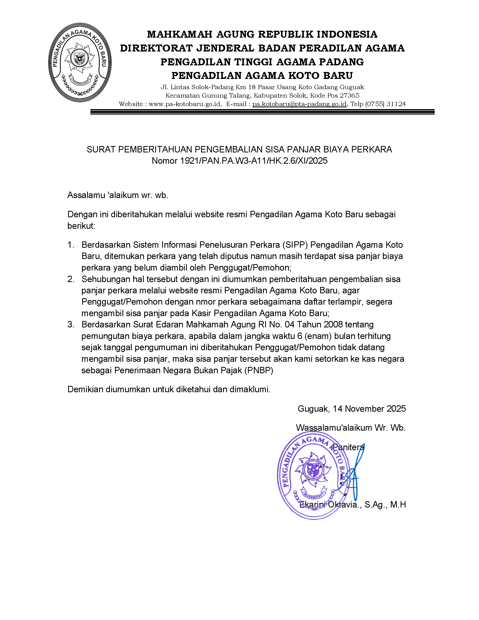 SURAT PEMBERITAHUAN PENGEMBALIAN SISA PANJAR BIAYA PERKARA