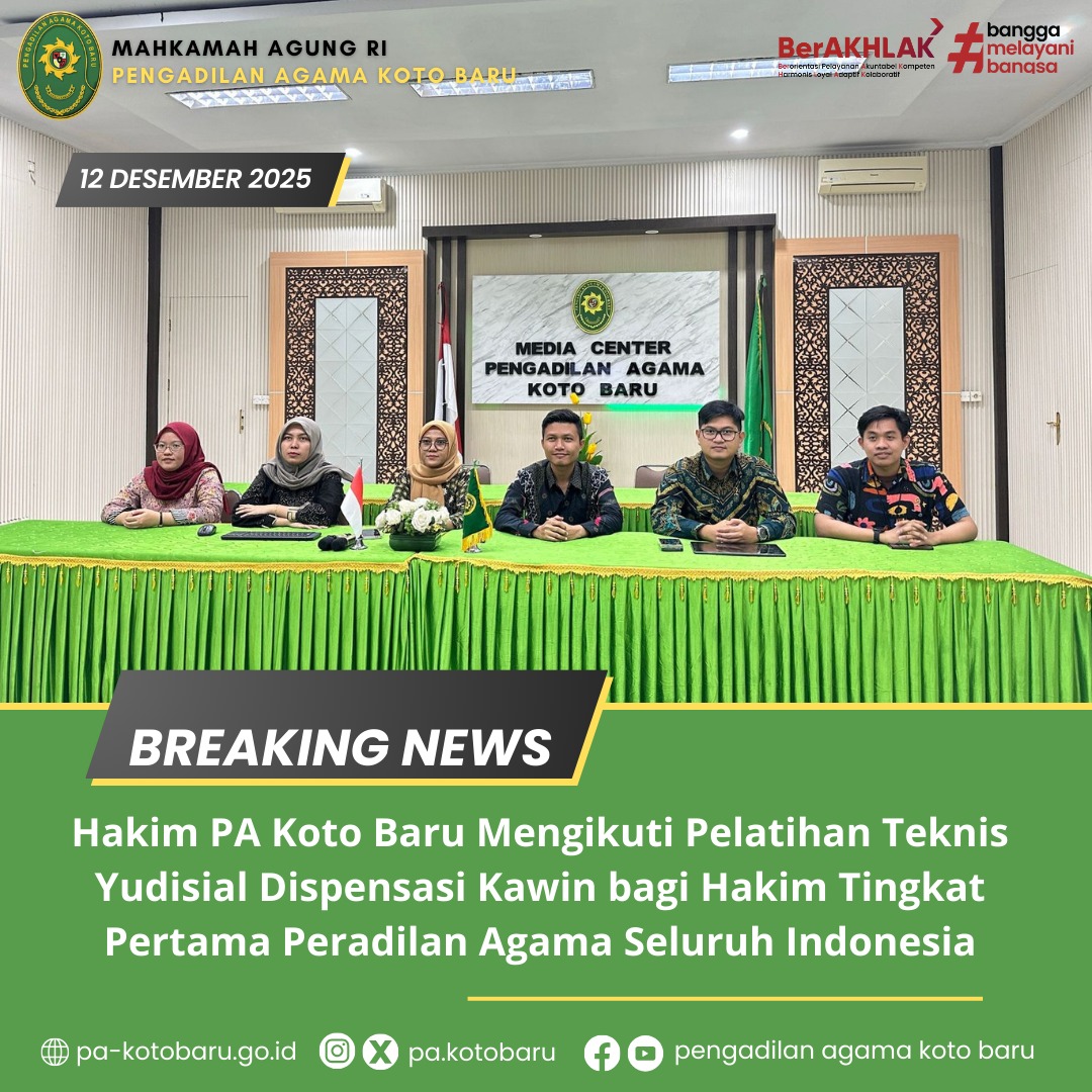 Pengadilan Agama Koto Baru terus berkomitmen dalam meningkatkan kualitas sumber daya manusia peradilan. Pada Jum’at, 12 Desember 2025, bertempat di Media Center Pengadilan Agama Koto Baru, sebanyak 6 (enam) Hakim Pratama, yaitu Adila Shabrina, S.H., Cici Arista Anwar, S.H., Hendra Rusliyadi, S.H., M. Ilham Azizul Haq, S.H., Septa Tri Sanjaya, S.H., dan Widiya Yusmar, S.H., M.H., mengikuti penutupan kegiatan Pelatihan Teknis Yudisial Dispensasi Kawin bagi Hakim Tingkat Pertama Peradilan Agama Seluruh Indonesia.