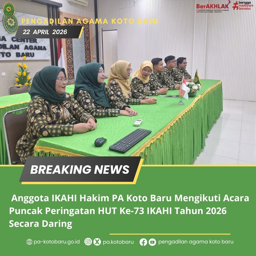 Anggota Ikatan Hakim Indonesia dari Pengadilan Agama Koto Baru mengikuti acara puncak peringatan Hari Ulang Tahun (HUT) ke-73 IKAHI Tahun 2026 yang diselenggarakan secara daring. Kegiatan ini merupakan bagian dari rangkaian peringatan nasional yang diikuti oleh seluruh hakim di Indonesia sebagai bentuk kebersamaan dan solidaritas dalam satu wadah organisasi profesi.